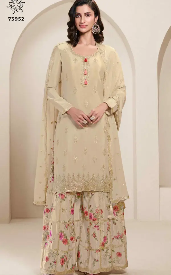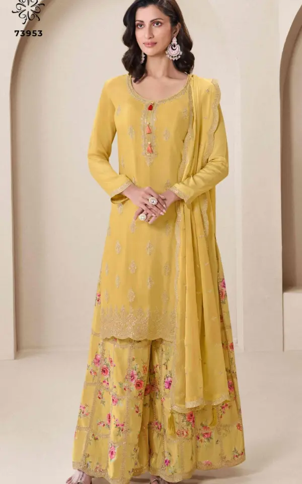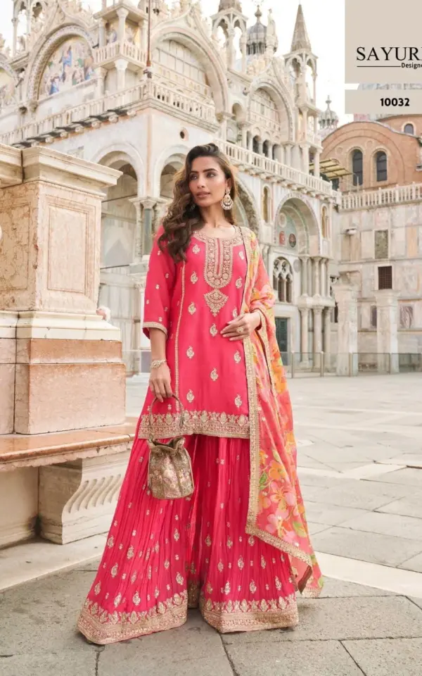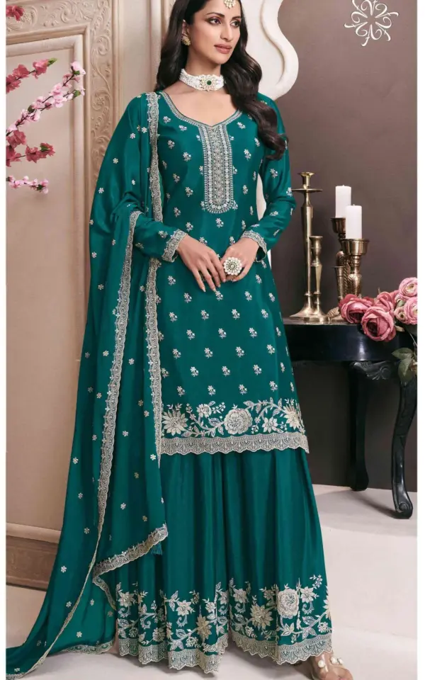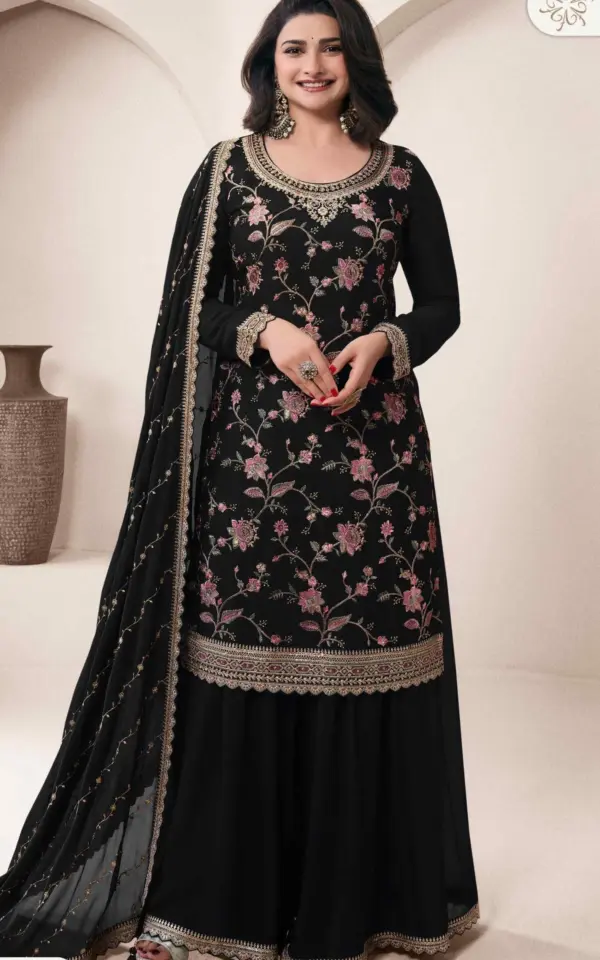 | Details | Designer Thread Embroidered Chinnon Top (Unstitched), Designer Thread Embroidered Sharara Bottom (Stitched), Designer Thread Embroidered Chinnon Dupatta |